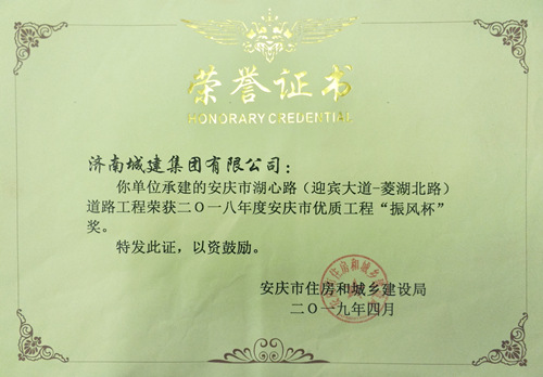 安慶市湖心路(迎賓大道-菱湖北路)道路工程被評為2018年度安慶市優(yōu)質工程“振風杯”獎