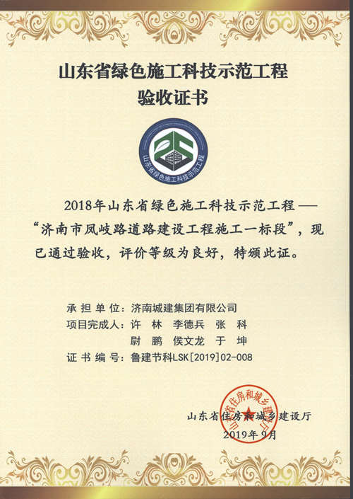 濟南市鳳歧路道路建設(shè)工程施工一標(biāo)段被評為2018年山東省綠色施工科技示范工程