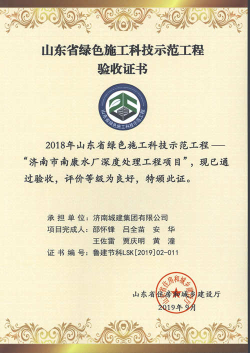 濟南市南康水廠深度處理工程項目被評為2018年山東省綠色施工科技示范工程